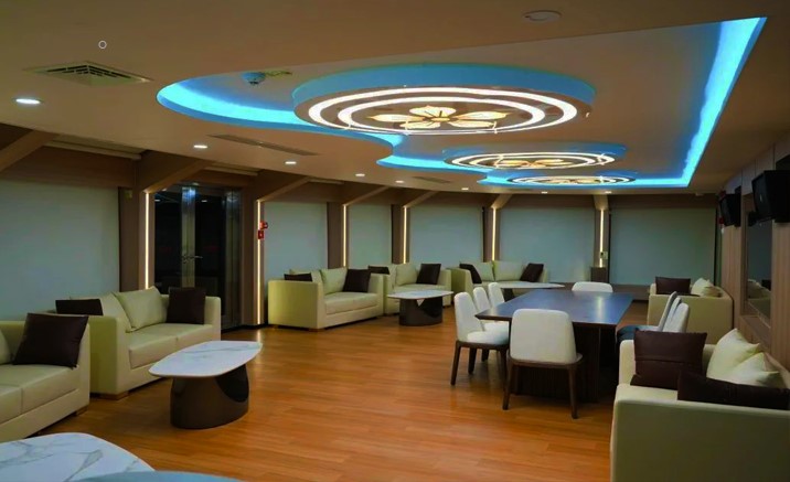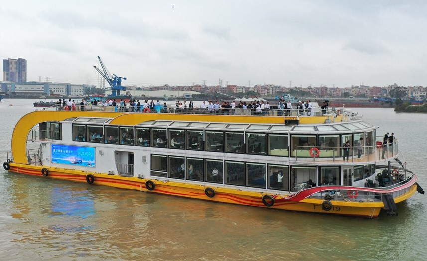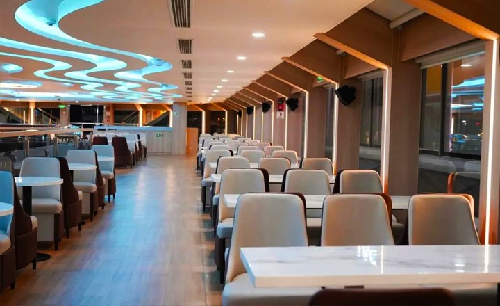 “鹅潭印象号”是广州公交集团客轮公司最新推出的三层式新型节能环保游船,总面积为917平方米,可容纳380人。船内采用欧式中空设计风格,天花灯饰线条结合了丝绸文化元素,与软装曲线纹理与之呼应,大面积的落地窗通透明亮,乘客在大厅用餐时可以将绝色江景尽收眼底。