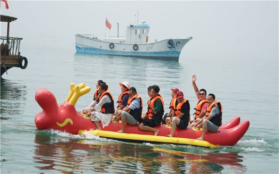 海上互动:在海洋牧场平台上游客可以逗河豚,玩章鱼海胆海星,与鱼共舞,海上行走,钓鱼等,可以零距离与海洋生物互动娱乐,岸上儿童乐园有水上滑梯、遥控船、七彩手摇船等儿童娱乐项目。